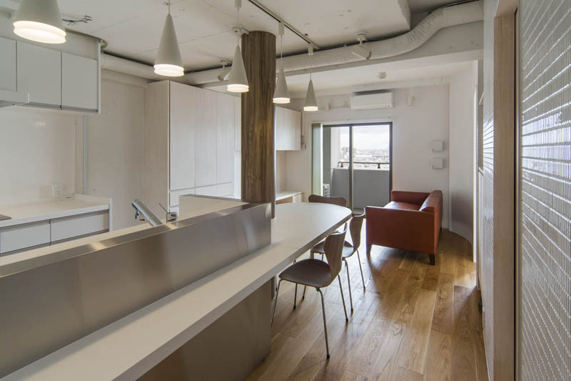 65㎡3LDKをゆったりとしたLDKを持つ4LDKにリノベーション クライアントご家族(ご夫婦+お子さん2人)は65㎡3LDKの間取りと少ない収納容量に問題を抱えておられ、ご主人のお仕事のスタイルも関係し家族それぞれが個室(4室)を持てることと、収納容量を飛躍的に改善したいという希望をお持ちの中プランがスタートしました。実施案では個々のスペースは寝床と収納のみからなるコンパクトなスペースとし子供達のベッドへはそれぞれのスペースの上下からアクセスとすることで省スペース化を試みています。また隣戸との界壁沿いは全て収納スペースとし容量を少しでも改善するために以前の天井裏スペースは露出させています。LDKはパントリーが併設されたセパレートのキッチンにカウンター+ダイニングテーブルが空間に連続性を与え、再レイアウトされた水回りは廊下からLDKに続く壁の背面に隠され、モザイクタイルがアクセントなり奥へと導いてくれます。 |