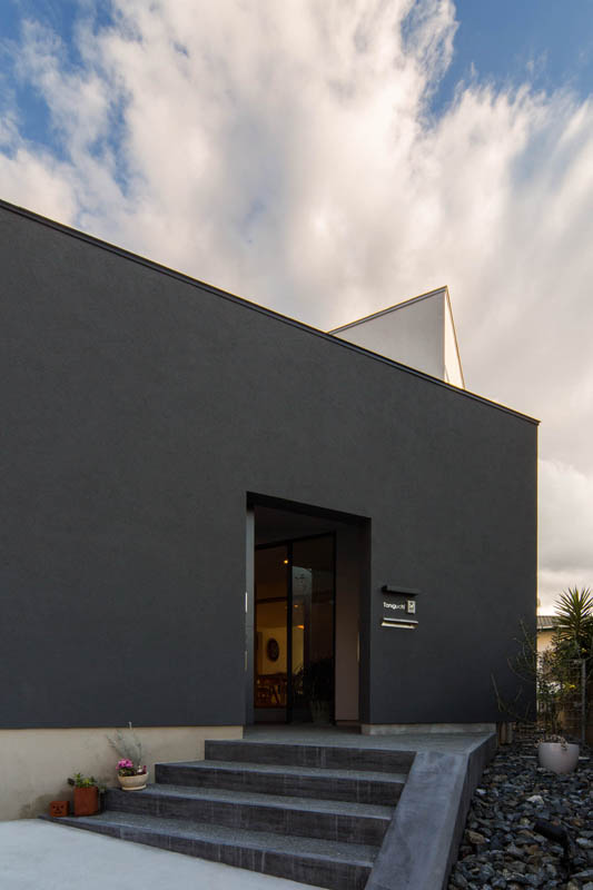 ほぼ平屋での生活空間 神戸山手にある敷地からは海~市街地を望める抜けがあります。 この風景と愛車に挟まれる位置にリビングダイニングを配し主寝室や機能空間を連結させた1階で完結する生活空間が提案されています。 北側に位置する螺旋階段の納まる吹抜のハイサイドライトからは1階のダイニングやエントランスホールにまで南光が届けられます。 また前面道路は狭いため道路から引いた空地を設け来客に対応しながらプライバシーを高める盾としてのデザインがほどこされています。 アプローチの引き戸内部にはセキュリティーの保たれたフロントコートが風の道をつくり閉じながら開く空間を担保しています。